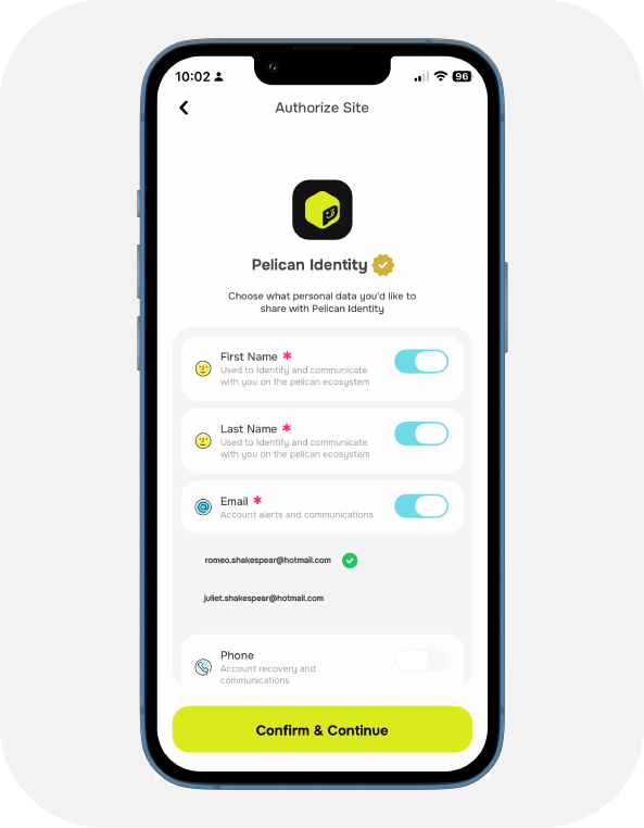 Whether you're opening a bank account, verifying your age, signing into an app, or checking in at a hotel — your Pelican identity is ready. No forms. No repeated KYC. No friction. You share only what's needed — nothing more.